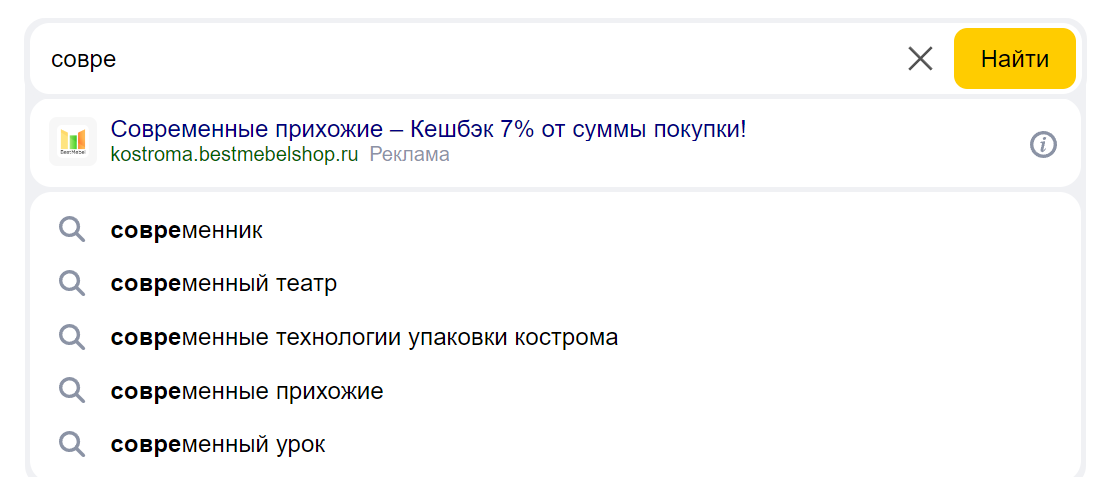 Сейчас реклама присутствует даже в поисковых подсказках запросов, однозначно не категоризирующихся как коммерческие: